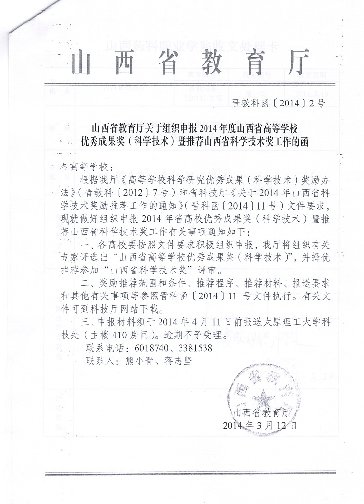 近日,山西省教育厅下发了“山西省教育厅关于组织申报2014年度山西省高等学校优秀成果奖(科学技术)暨推荐山西省科学技术奖工作的函”(晋教科函[2014]2号文)。请院各有关部门对照文件要求,积极组织申报。有关文件可到科技厅网站下载。