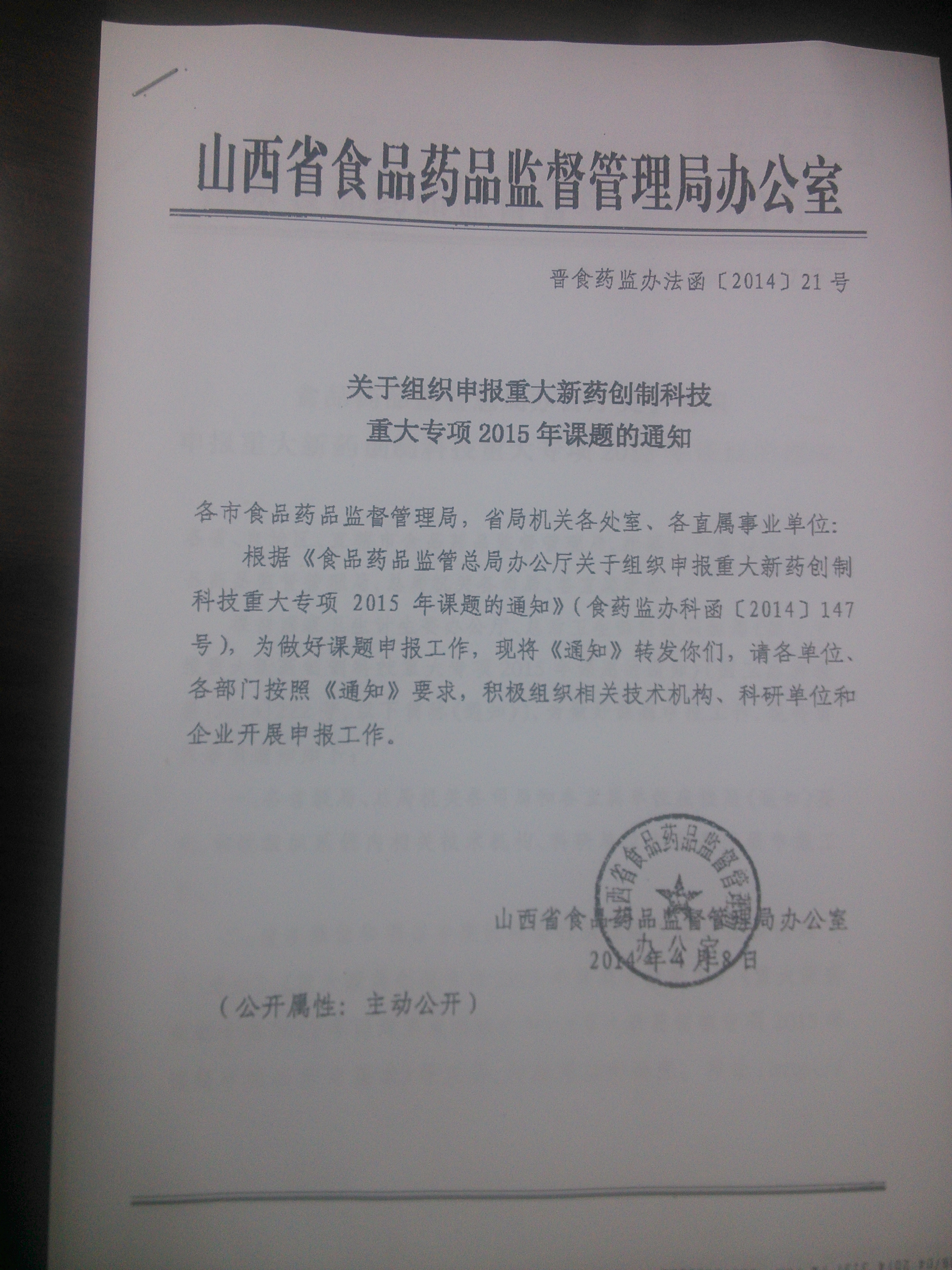 按照山西省食品药品监督管理局办公室“关于组织申报重大新药创制科技重大专项2015年课题的通知”(晋食药监办法函[2014]21号),为做好课题的申报工作,现将《通知》转发如下,请院各有关部门、各单位按照附件3要求,积极组织开展申报。申报资料交至科研中心李世相处。电子版发送至275119432@qq.com。