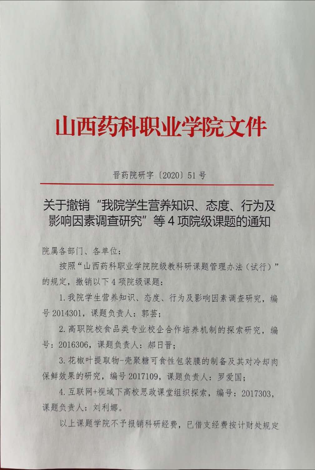 关于撤销“我院学生营养知识、态度、行为及影响因素调查研究”等4项院级课题的通知