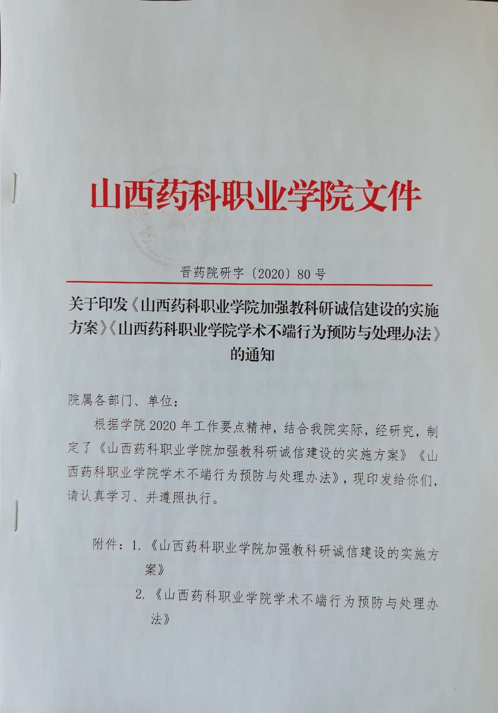 关于印发《山西药科职业学院加强教科研诚信建设的实施方案》《山西药科职业学院学术不端行为预防与处理办法》的通知