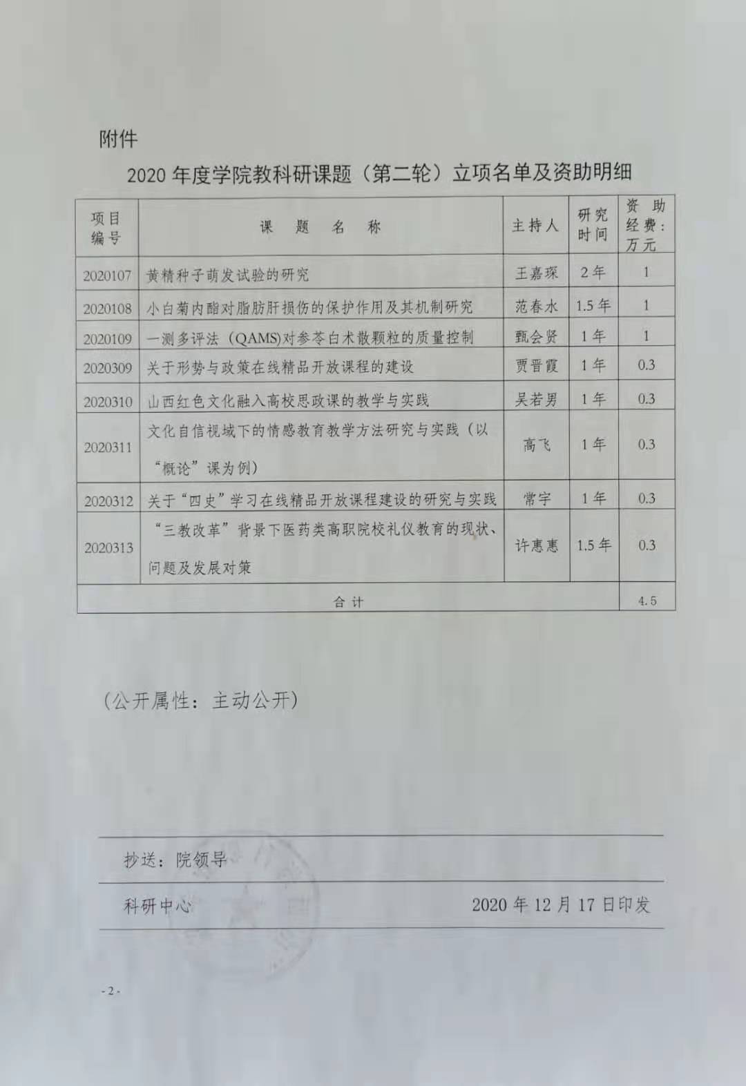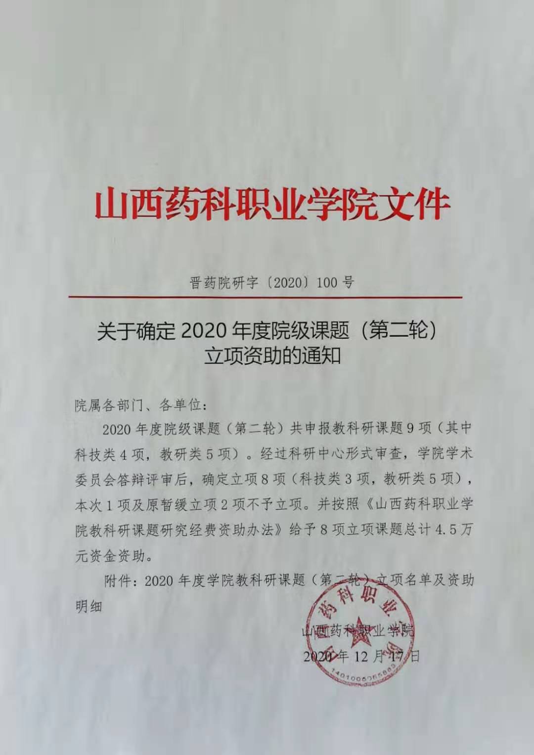 关于确定2020年度院级课题(第二轮)立项资助的通知