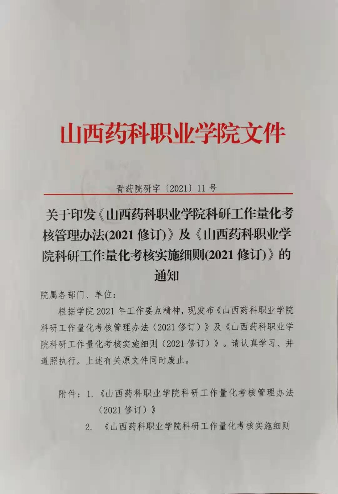 关于印发《山西药科职业学院科研工作量化考核管理办法(2021修订)》及《山西药科职业学院科研工作量化考核实施细则(2021修订)》的通知