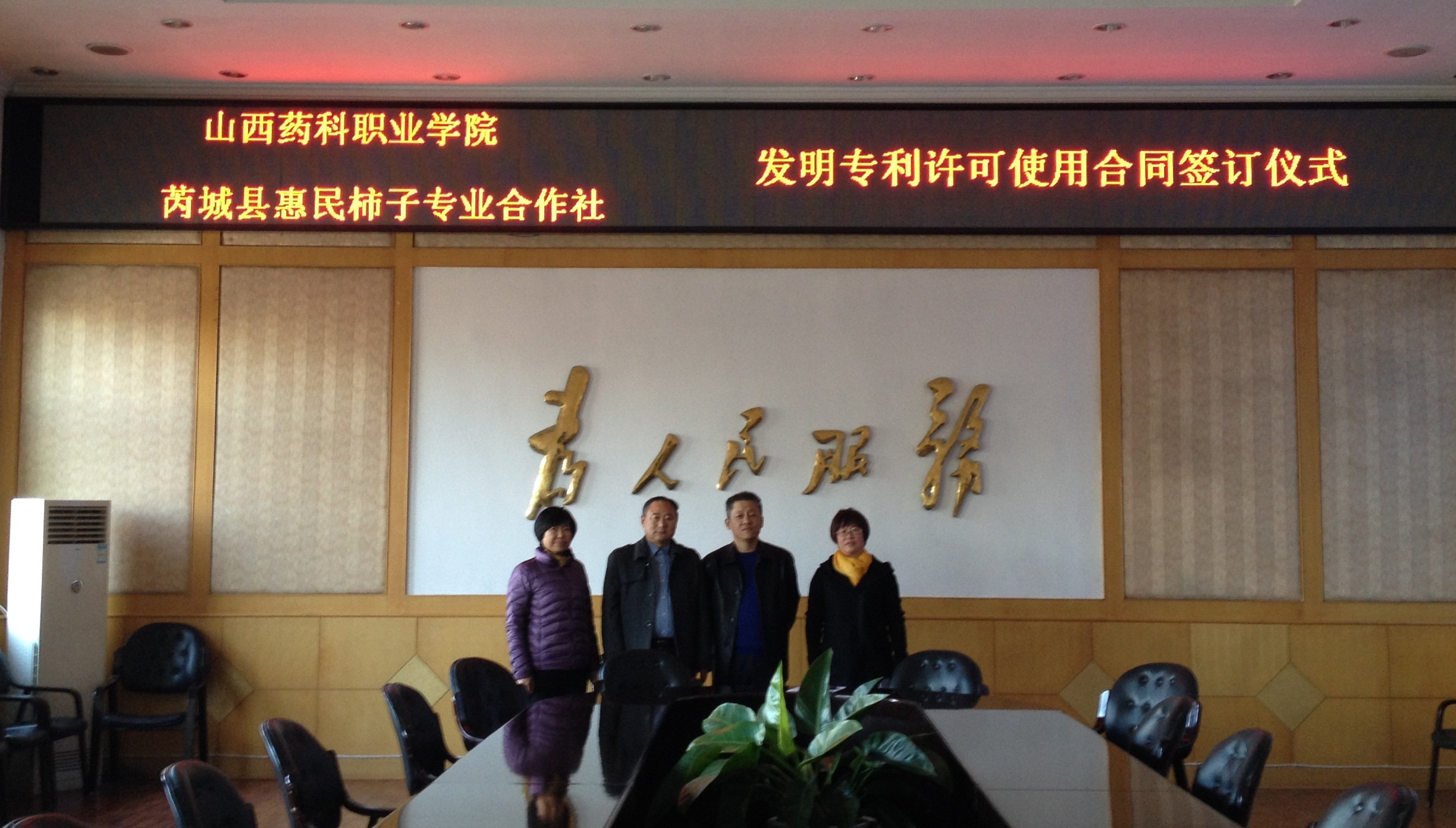 山西药科职业学院始终坚持增强社会服务能力的办学定位,从学院专业的实际情况出发,结合地方经济发展需要,深化校企合作,组织教师不断开展科学研究,并取得了一定的成绩,特别是2014年成功申报了“一种苹果醋的制备方法” 发明专利。为积极有效地增强社会服务能力,学院将所有的“一种苹果醋的制备方法” 发明专利许可给山西省芮城县惠民柿子专业合作社使用。