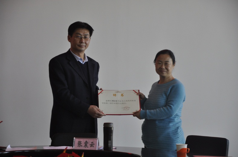 2016年11月23日下午,山西药科职业学院第三届学术委员会在办公楼523会议室召开全体委员会议。有24名学院第三届学术委员会委员和特邀委员参加了会议。会议由学院学术委员会秘书长张虹主持,学院党委副书记、院长张震云发放聘书并作重要讲话。