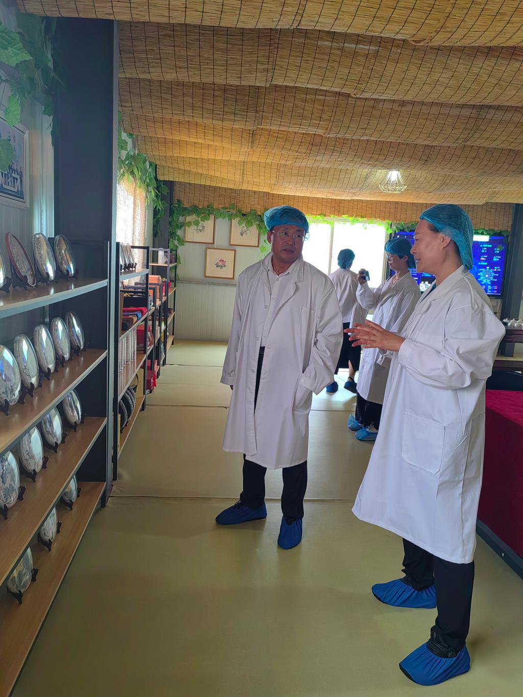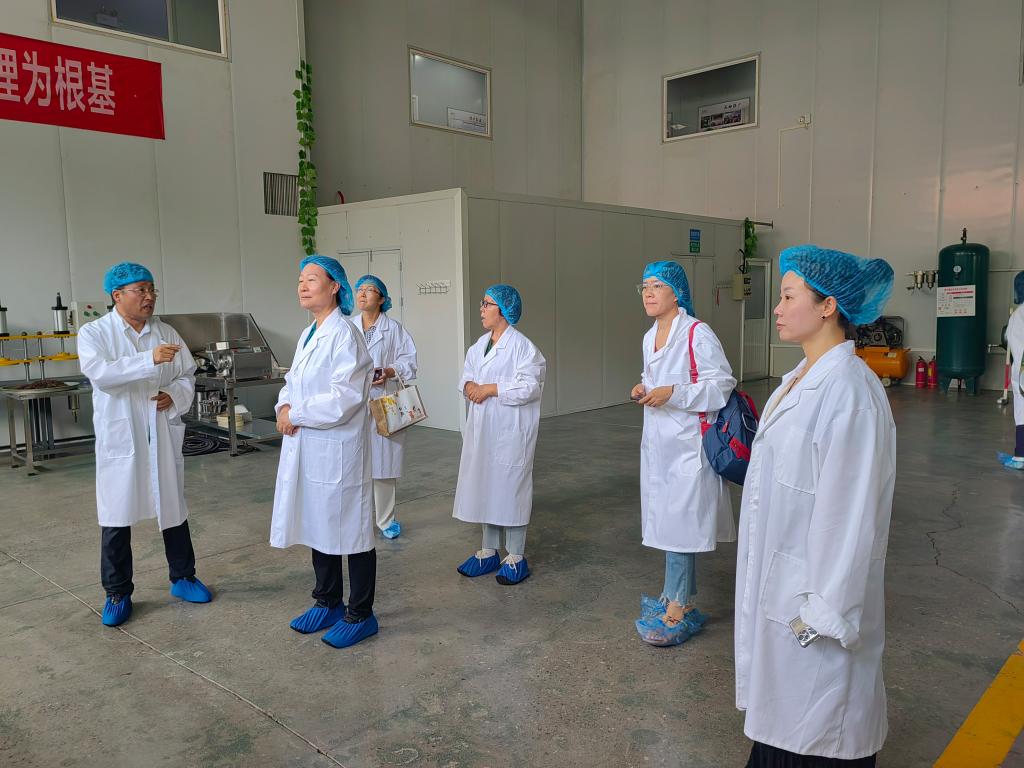 调研首站来到冠山连翘茶标准化生产车间。张怀军介绍,公司创新生产模式,兼顾效率与质量,保证产品批次稳定、品质优良。调研团队认真观察记录,与工作人员交流,了解生产技术和质控措施,为后续研发合作积累经验。