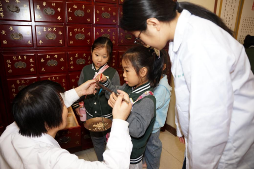 在中药调剂技艺传承基地,孩子们认识了戥秤、药碾等传统工具,了解“抓药”“称量”的流程,感受古老技艺的精妙。