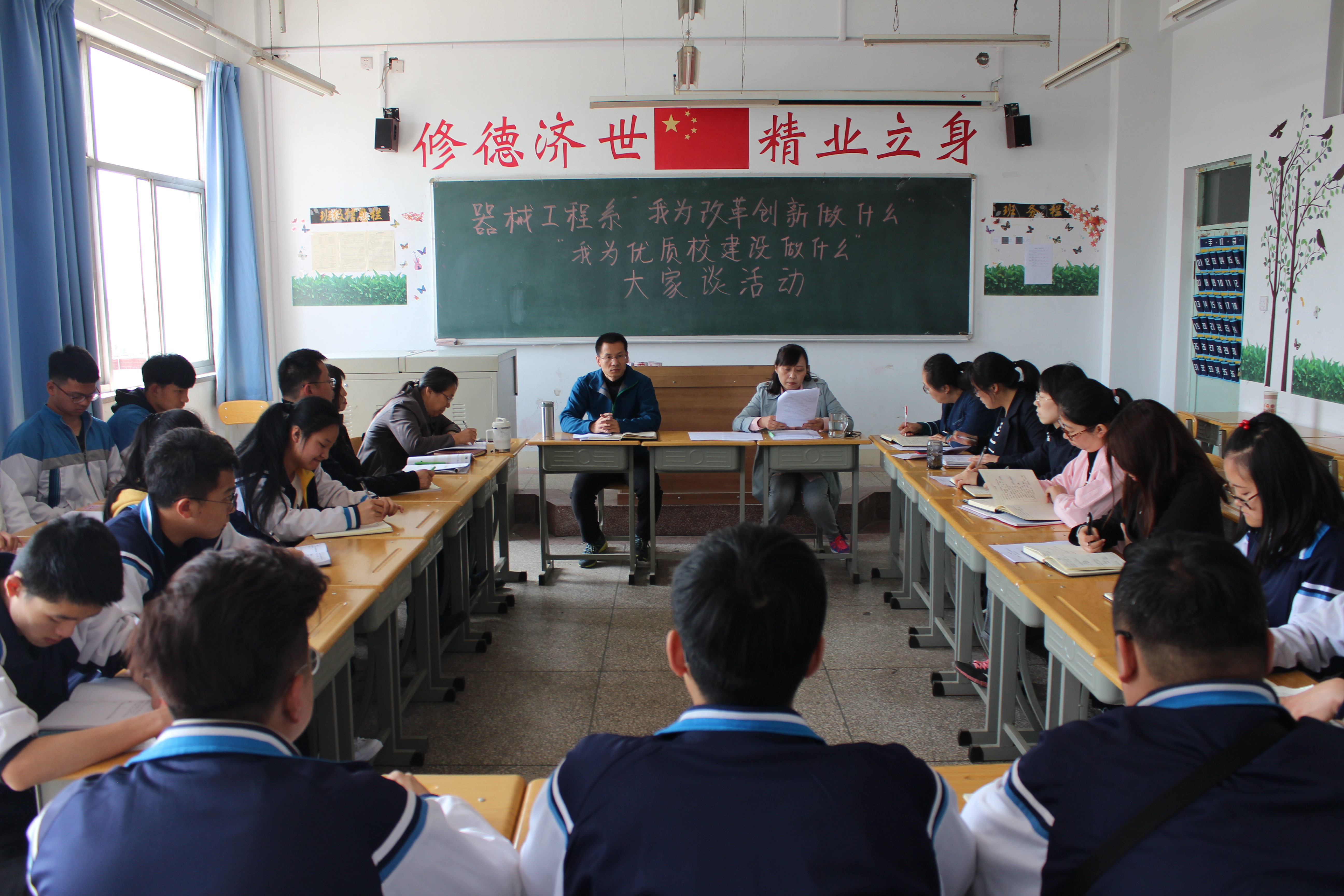 2019年4月15日,器械工程系党总支组织全体教职工、学生代表开展“我为改革创新做什么、我为优质校建设做什么”大家谈活动座谈会。座谈会由系党总支书记郁敏主持。