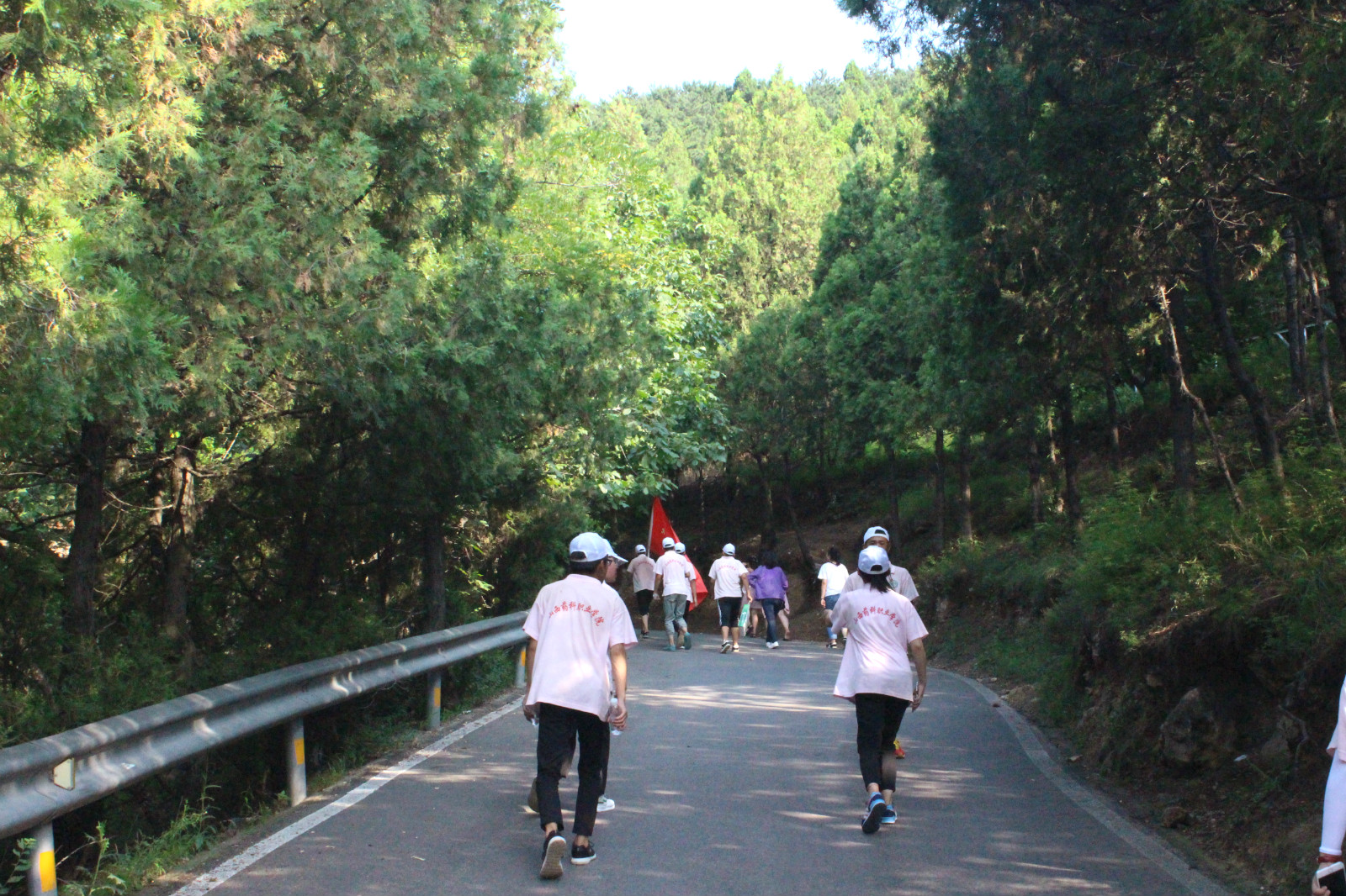 在太阳正在头顶的时候,队员们就开始集结出发,从老顶山山下到山上,队员们各个热情高涨、兴致勃勃,带着昂扬的斗志整装待发;整个过程中充满了温馨、愉快,大家相互帮助、相互鼓励,共同完成了素质拓展活动。沿路上一边爬山,一边四处捡寻垃圾,尽管头上的汗顺着脸颊往下流,但看到地上被丢弃的垃圾,队员们也都及时清理干净。下山的路上,大家都说“这次环保登山行动好!”不仅锻炼了身体,又清洁了老顶山,一举两得。