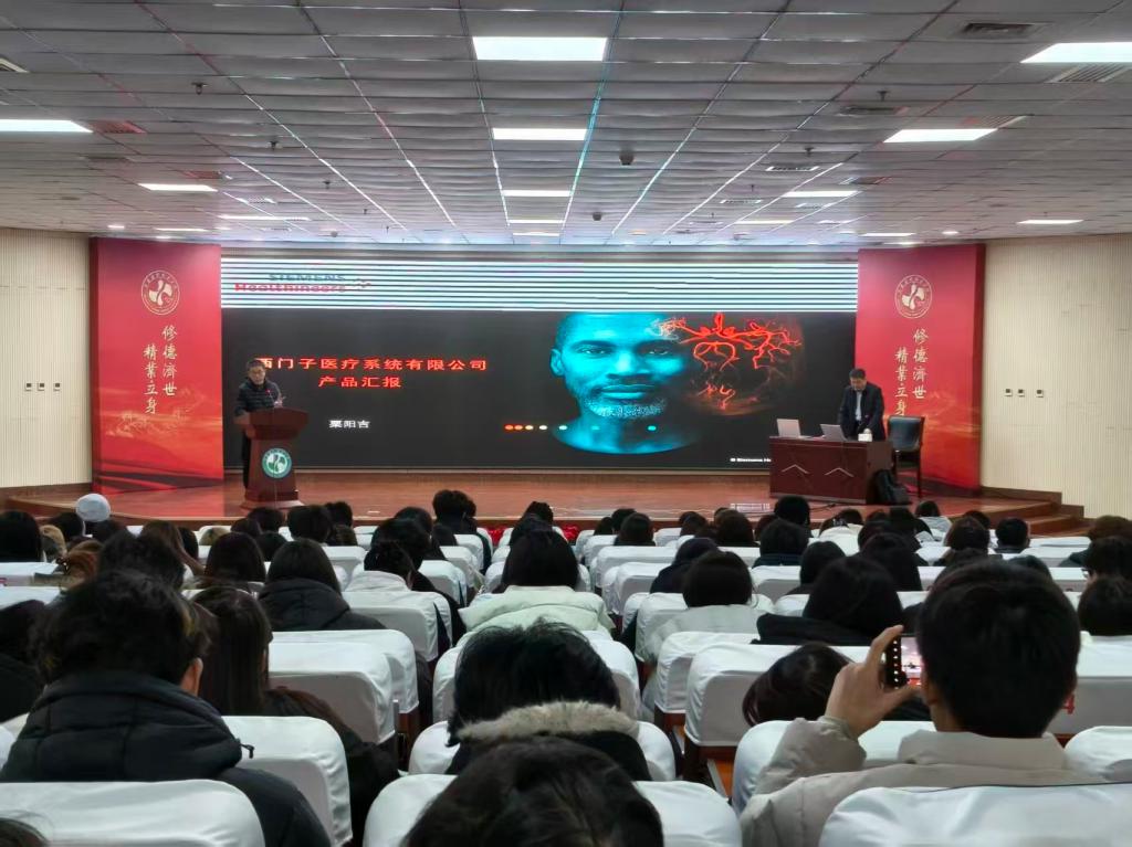 栗阳吉学长1999年就读于我校中药专业,2003年对口升学升入我院药检专业,深耕医疗行业多年,毕业后先后在上海三共、辉瑞、拜耳、西门子等公司工作,通过自身的不断专研学习,实现跨专业转型,现任西门子医疗系统有限公司非公医院销售经理。讲座中,他聚焦西门子系列产品,展示了检验科、介入科、核医学科、放疗科等重点科室使用的大型医疗器械设备,着重介绍了质子重离子中心。细致拆解磁共振的分类及行业应用要点,用工作经历以及专业积累为同学们打通理论与实践的衔接通道。