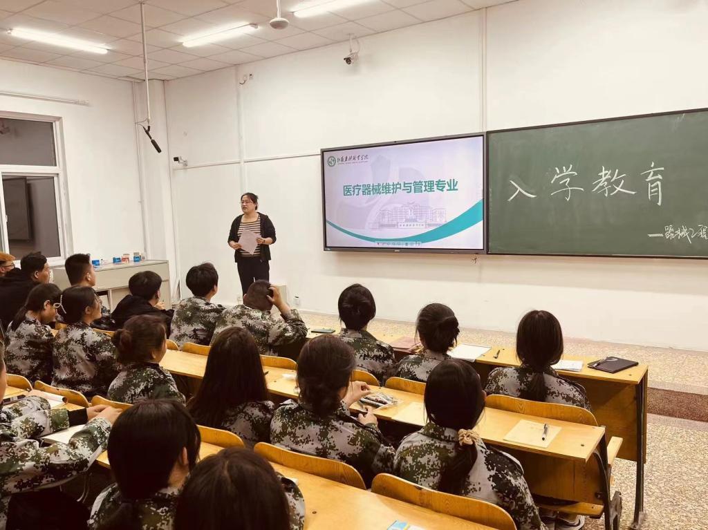 为帮助 2023 级新生尽快认知专业,明确未来发展方向和目标,更好规划大学生活,9月28日晚,由器械工程系副主任马乐萍老师,为我系医疗器械维护与管理专业2023级新生开展了入学教育活动,内容主要包括专业简介、社会需求、核心技能、课程体系、考核要求、就业面向、毕业要求等。活动现场马乐萍老师通过互动方式及答疑解惑环节,引导同学们发散思维,加深专业认知。最后,两位教师为同学们送上了美好祝福和殷切期盼。