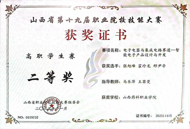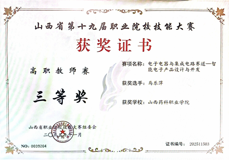 2025年11月23日,山西省第十九届职业院校技能大赛“电子电器与集成电路赛道-智能电子产品设计与开发”赛项在长治机电职业技术学院圆满落幕。我系医疗器械维护与管理专业学生张旭峰、霍珍龙、邢尹亭组成的参赛队在马乐萍、王菲斐老师的指导下,凭借扎实的专业功底与出色的临场发挥,在比赛中脱颖而出,荣获团体二等奖。同时,马乐萍老师斩获教师组个人三等奖。