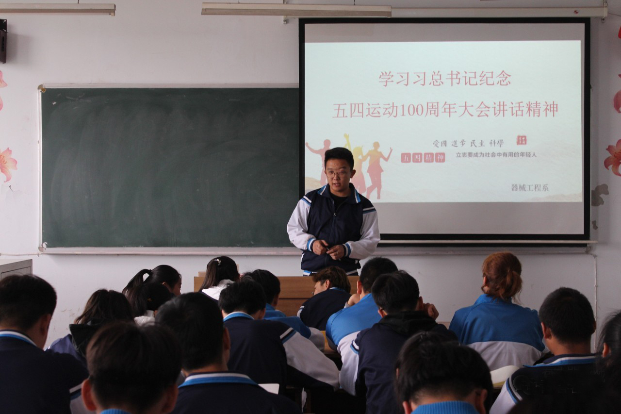 为认真学习宣传贯彻习近平总书记在纪念五四运动100周年大会上的重要讲话精神,扎实开展“青春心向党,建功新时代”主题教育活动。5月7日上午,器械工程系分团委组织全体团学干部开展纪念五四运动100周年大会精神的学习,并进行心得体会交流。