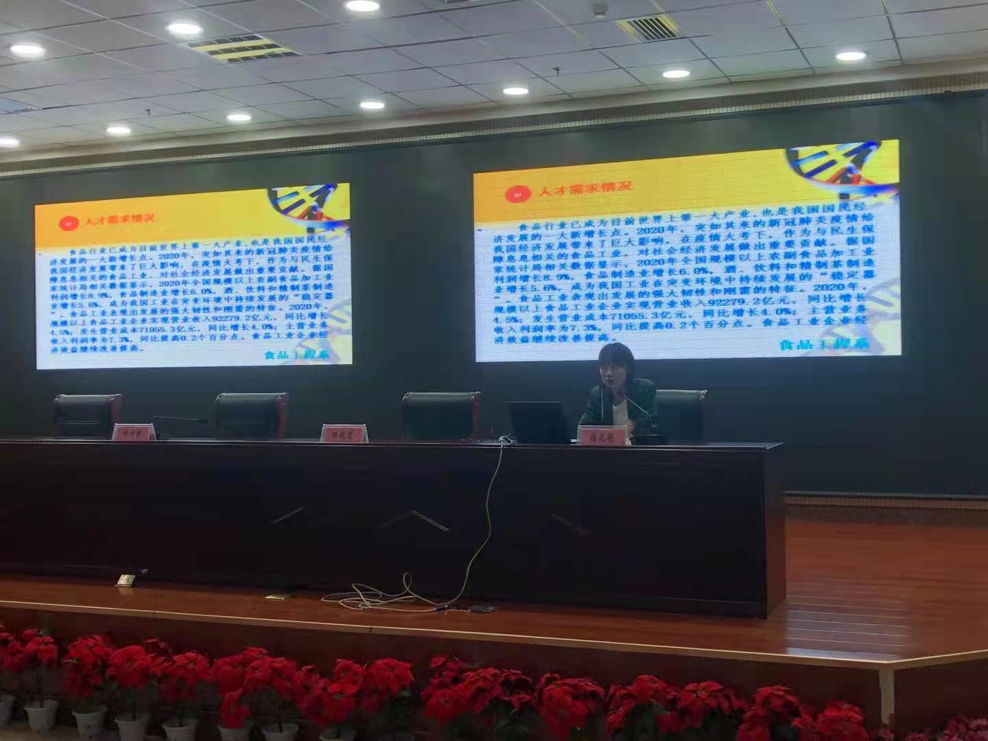 会上,食品检验检测教研室主任田艳花、食品生物技术教研室主任郭芸、农产品加工与质量检测教研室主任刘娜丽分别就自己负责的专业,从行业岗位人才需求、专业特色、课程结构、就业前景等方面作了详实的讲解,并鼓励同学们要丰富课余生活,提升人生阅历。