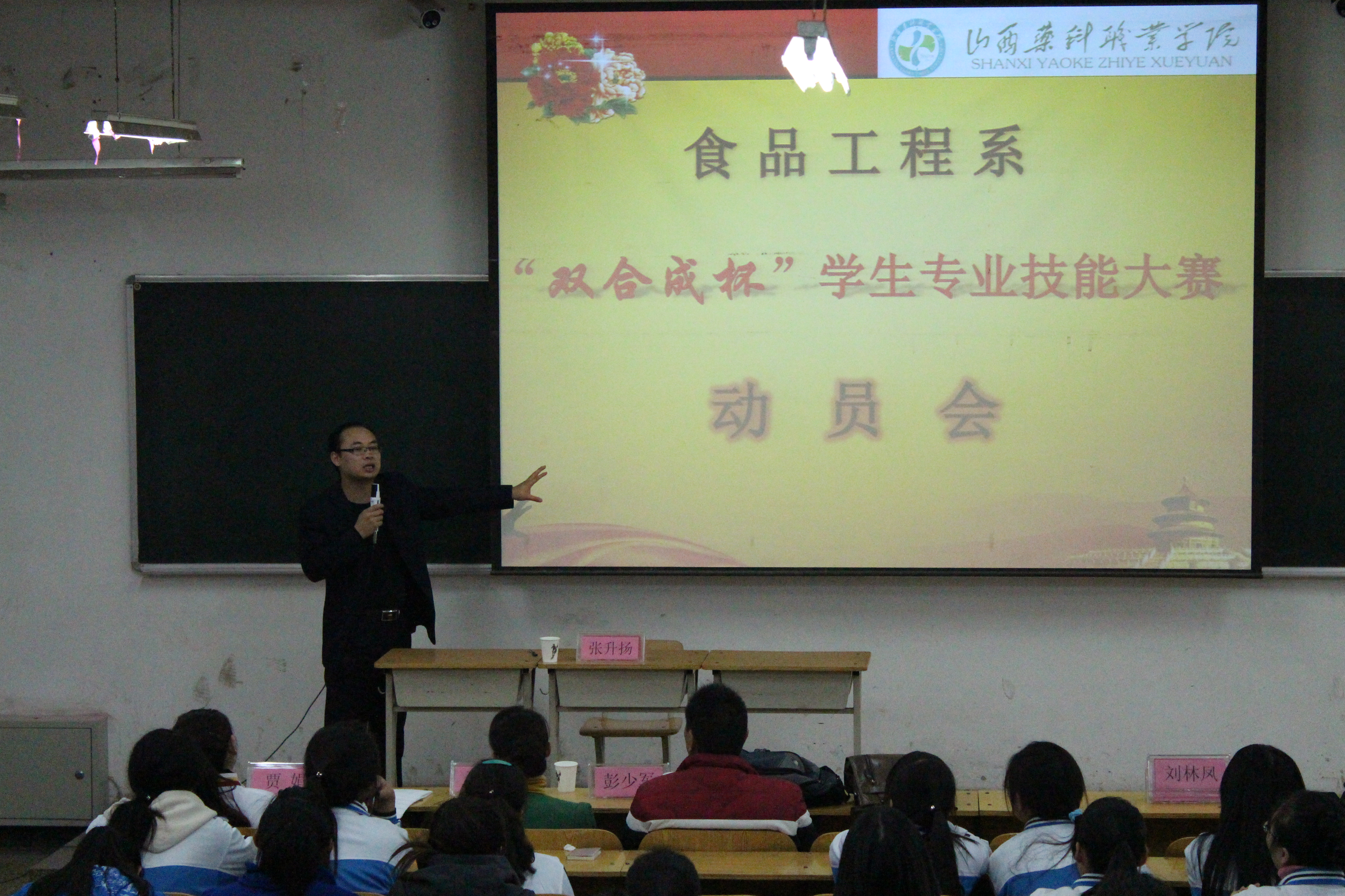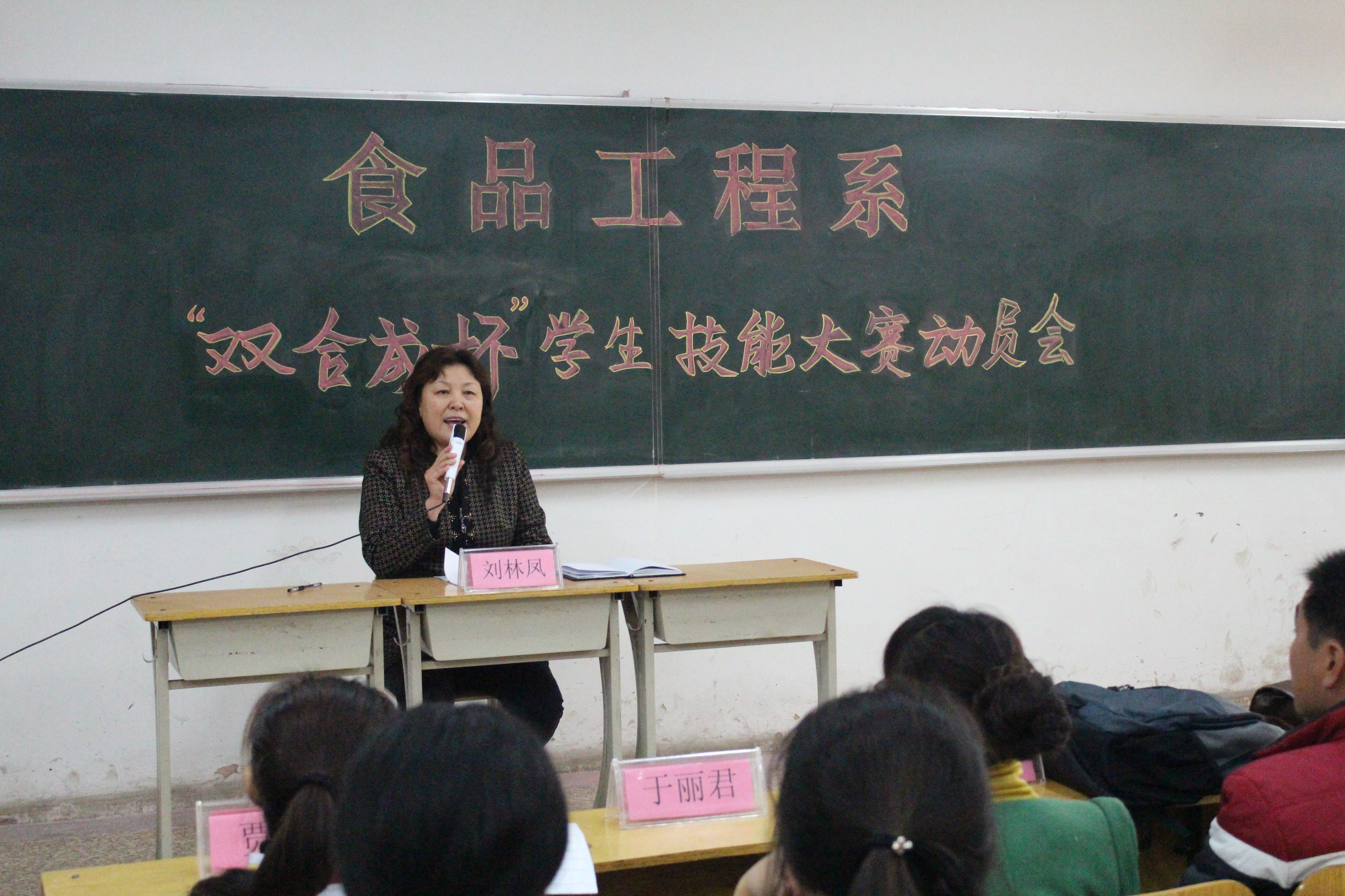 2014年11月5日下午,我系于东教学楼二层二阶召开了“双合成杯”学生专业技能大赛动员会。莅临本次会议的校外专家有山西省焙烤食品行业协会秘书长张升扬、太原市双合成食品有限公司人力资源总监彭少军、技术主管于丽君、裱花技师贾娟,系主任刘林凤主持会议,食品工程系全体教师及二年级全体学生参加了大会。