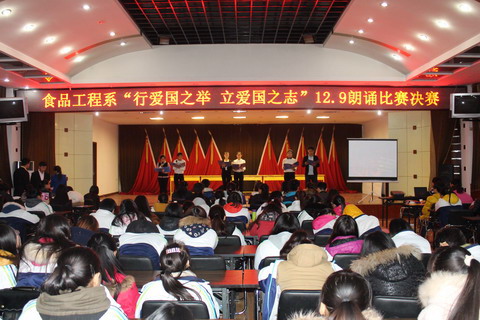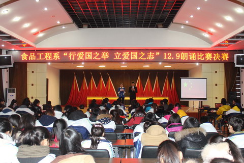 为了继承和发扬爱国主义精神,纪念“一二.九”学生爱国运动,2014年12月4日,食品工程系在报告厅举办了以“如火青春的诉说”为题的“行爱国之举,立爱国之志”“一二·九”朗诵比赛决赛。董康慧、冯小军老师和院、系部分学生干部出席了比赛,我系全体一年级学生观看了比赛。