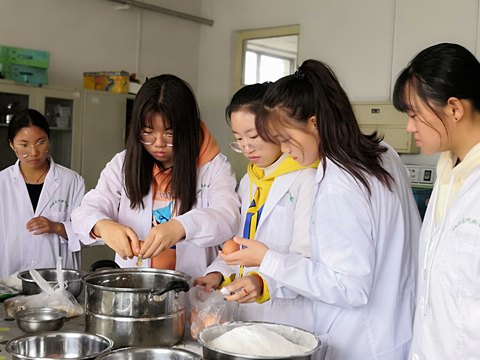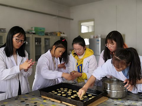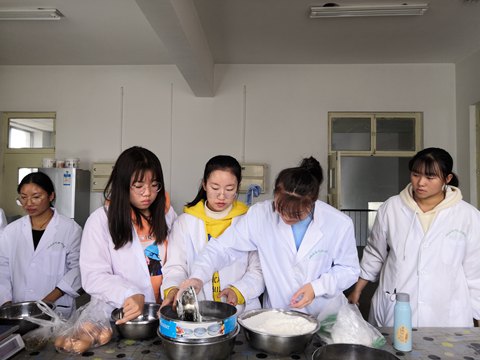 活动中,指导老师田艳花首先就制作桃酥的原料特性操作流程和注意事项进行了细致的讲解,随后同学们满含期待地纷纷动起手来,仿若已经闻到了桃酥酥软香甜的味道。从刚开始的称量面粉、打鸡蛋、和面时的小心翼翼到最后制作桃酥烘焙过程中的运筹帷幄,无处不体现同学们的认真细致和团结合作,最终同学们也都做出了满意的成品