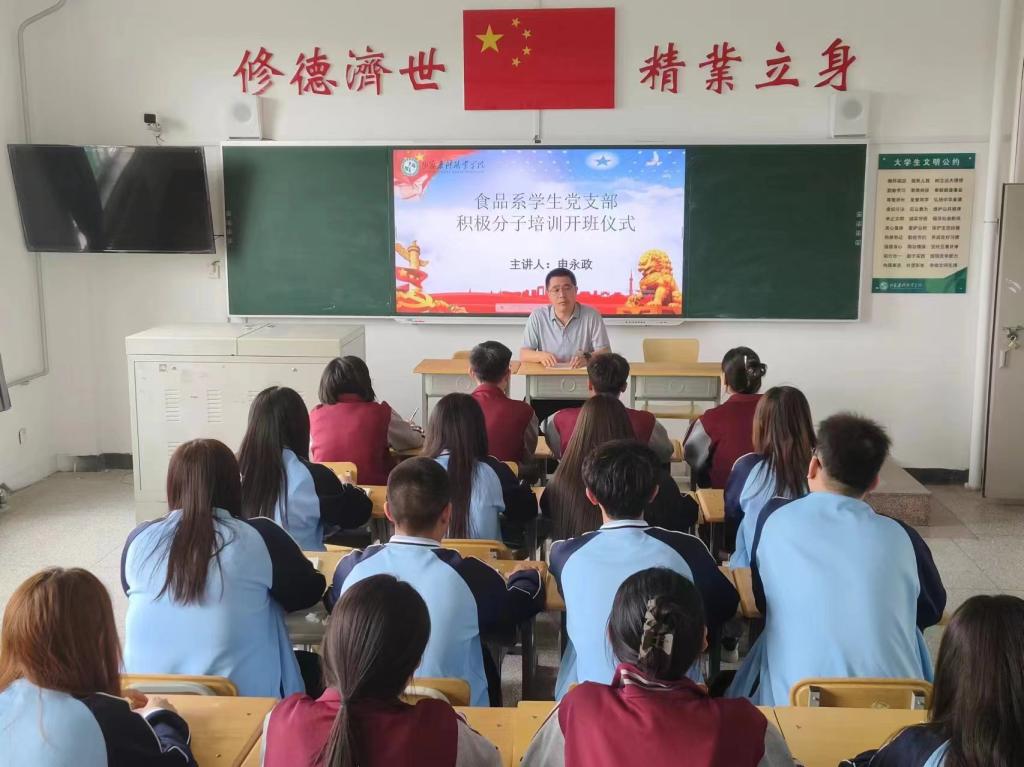 5月6日,食品系学生党支部举办2024年入党积极分子培训班开班仪式。系党总支书记申永政、学生党支部书记史大鑫及22名入党积极分子参加开班仪式,开班仪式由食品系学生党支部书记史大鑫主持。