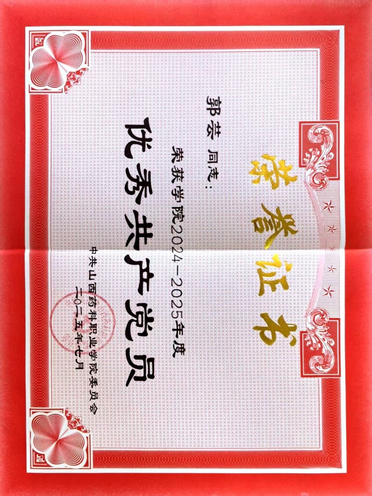 近日,中共山西药科职业学院委员会发布《关于表彰2024-2025学年优秀共产党员、优秀党务工作者和先进基层党组织的决定》,我系教师党支部书记凭借坚定的理想信念、突出的工作业绩和深厚的群众基础,光荣获评优秀共产党员称号,成为全院党员学习的榜样。