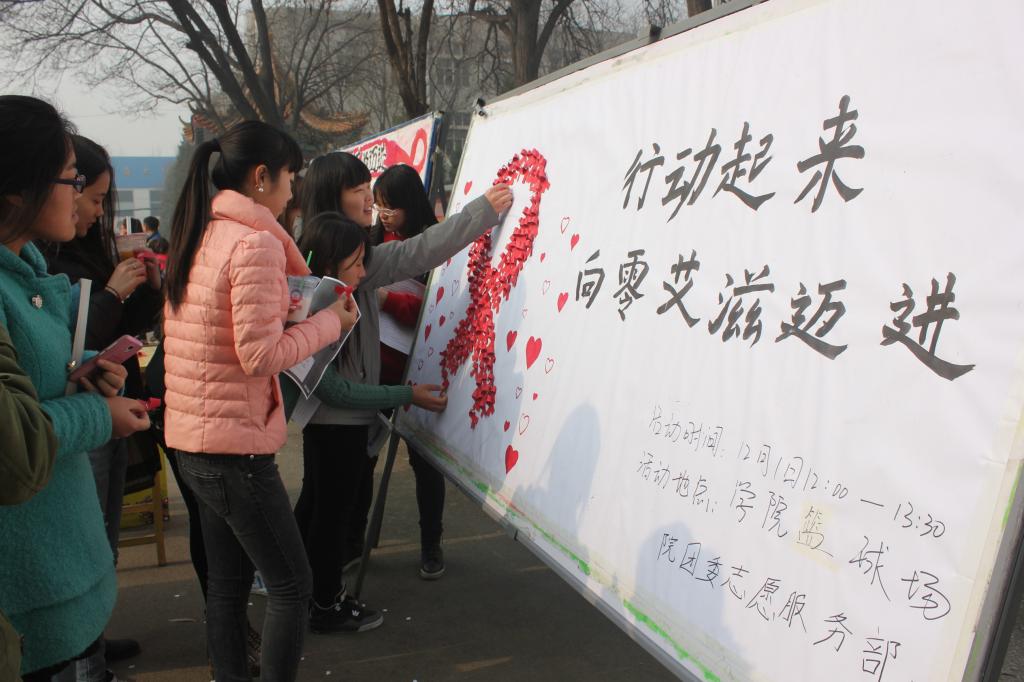 为响应团省委举办的“防艾•禁毒嘉年华”主题活动,同时做好大学生防艾、禁毒宣传教育工作,引导大学生树立预防艾滋病和抵制毒品的意识。12月1日中午,我院在学院操场以及校园主干道上开展了“行动起来,向零艾滋迈进”活动。