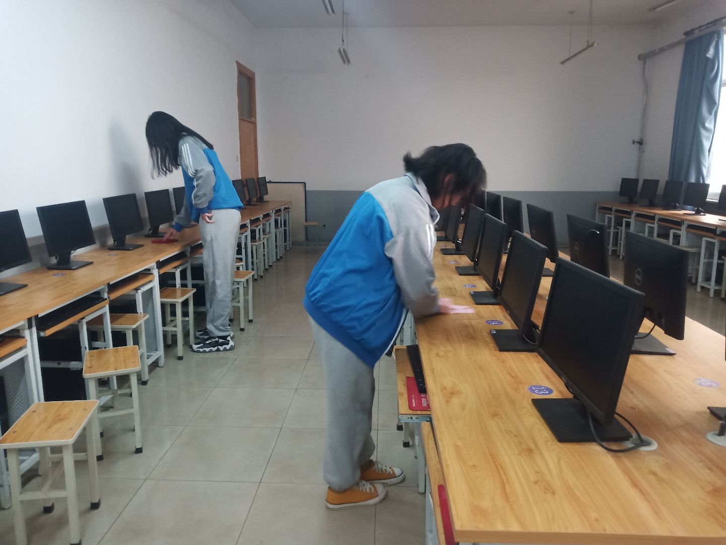 下午三点半,志愿者们准时到电教中心门口集合。在了解注意事项后,同学们领好扫帚、拖把、抹布等卫生清理工具进入一至九机房,开始扫地、拖地,擦拭桌椅、机箱外面的浮尘、窗户、窗台并摆放电脑桌椅,认真打扫机房的每个角落,尽管地面上有不少的灰尘和头发,虽然打扫起来很困难。但是,经过同学们的努力,机房呈现出了焕然一新的面貌,营造了一个干净、整洁的环境。