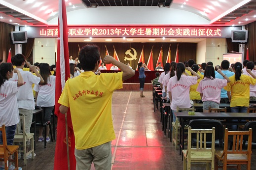 出征仪式上,各实践团领队、指导教师和实践队员举行了庄严而神圣的集体宣誓;与会领导为各社会实践团授旗;领队老师和社会实践队员代表分别发言。