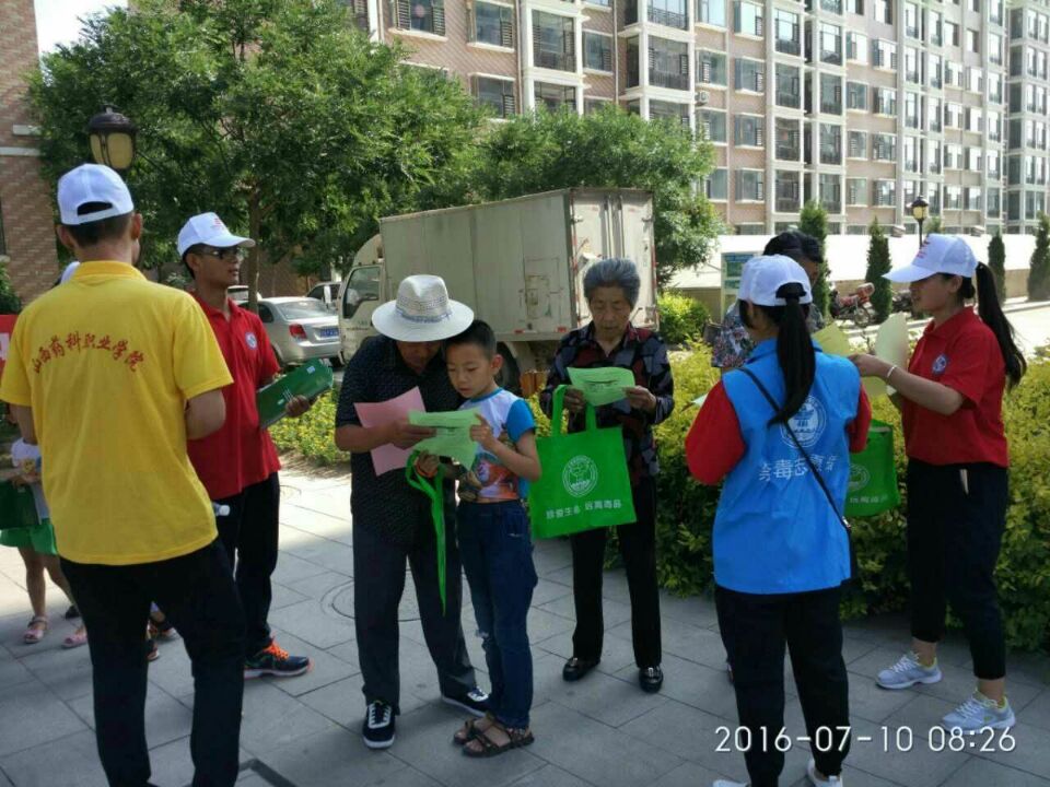 7月10日,我院赴阳高社会实践团队员们伴随着“一、二、三、四...”的口号声中,踏出了清晨的步伐。实践队员们分两批分别到达阳高佳家码广场、阳高文化馆广场和阳高首席小区、云林公园广场进行招生宣传、禁毒宣传、用药知识及食品安全宣传活动。在活动宣传的前期,了解到所选地人流量大,覆盖面广,为此次活动的宣传提供了便利的条件。