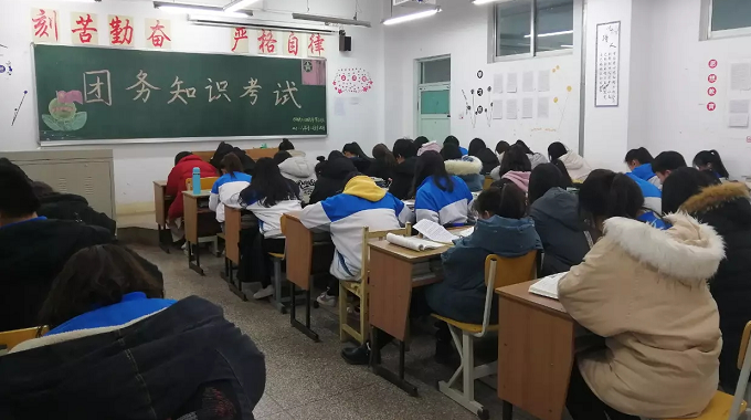 本次考试从党的十九大报告、共青团章程、“三会两制一课”内容、形势政策等几个方面,对学生的思想政治理论素养进行全方面,多角度的考核。考试过程中各班安静有序,同学们专心答题,认真检验自己的所学所得,巩固知识。
