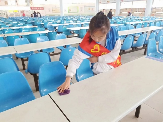 志愿者们进入餐厅后,便迅速行动起来,帮助清洁人员清扫桌面上的残羹剩饭,统一倒入指定的剩饭剩菜处理处;将桌上残留的废纸、空瓶子倒入垃圾桶,并与食堂工作人员一同打扫地面,为同学们打造了一个舒适整洁的用餐环境。活动过程中,志愿者们积极工作,与食堂工作人员相互配合,相互帮助,大大提高了食堂的清扫效率,让清洁工作更加顺利有效。