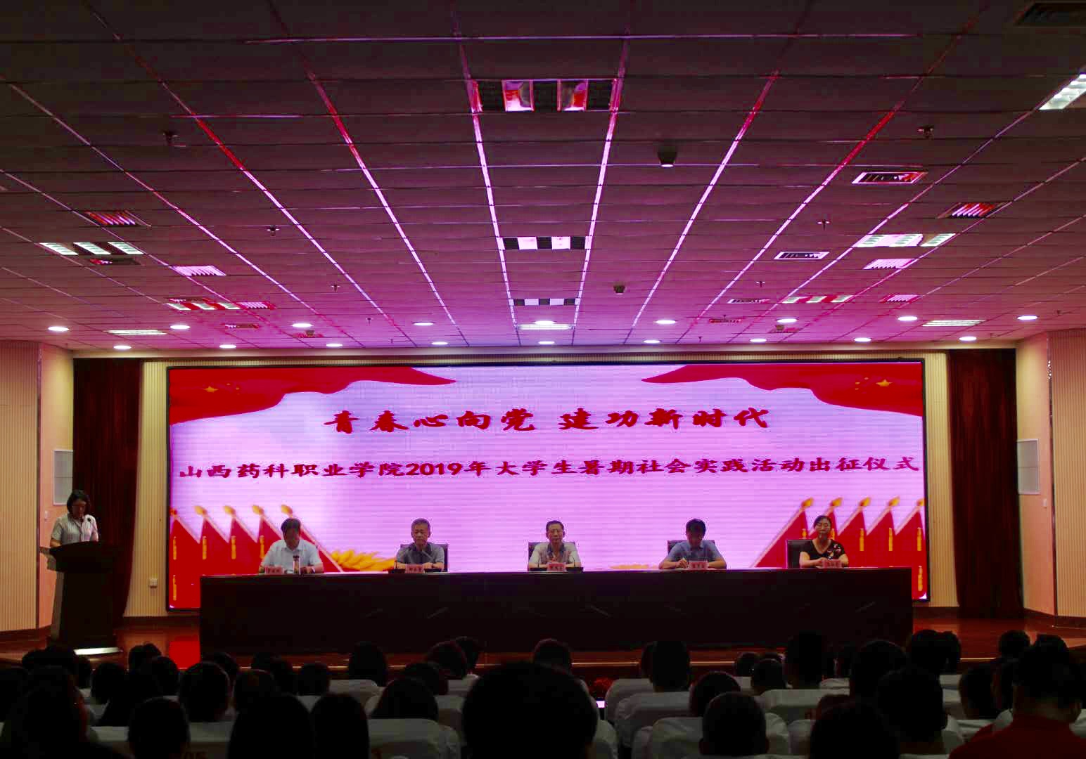 6月27日下午,学院“青春心向党·建功新时代”2019大学生暑期社会实践活动出征仪式在综合楼报告厅举行。院领导、各部门、单位主要负责同志、社会实践领队及实践队员代表300余人参加了此次出征仪式。仪式由院团委书记柴红萍同志主持。