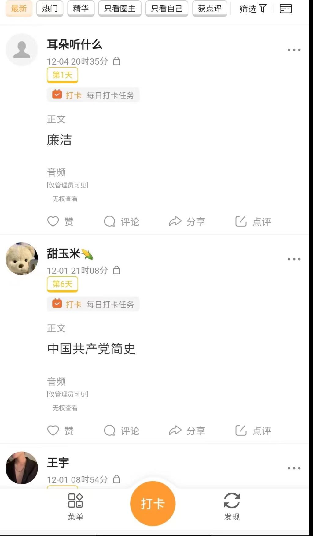 利用每日晨读时间,组织团员青年学习习近平总书记清廉语录、诵读经典著作。同学们选择自己喜欢的方式进行朗读,录制成相关音频、视频,在“小打卡”小程序上传打卡。《只留清白在人间》、《海瑞治贪》、《孔繁森:清正廉洁一心为公》……个人示范读、齐读、小组读大家从不同角度、不同层面深刻诠释清廉内涵。