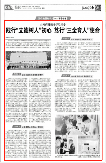 2022年,山西药科职业学院团委在院党委的领导下,以习近平新时代中国特色社会主义思想为指导,把学习贯彻党的二十大精神作为各级团组织的中心工作,以思想引领“立魂”,服务大局“立业”,扎根青年“立根”,全面从严治团“立身”,紧扣共青团的根本任务和工作主线,团结带领团员青年听党话、感党恩、跟党走,为推进学院建成全国一流药科职业院校、培养德智体美劳全面发展的高素质技术技能人才书写了合格的“药院青年答卷”。