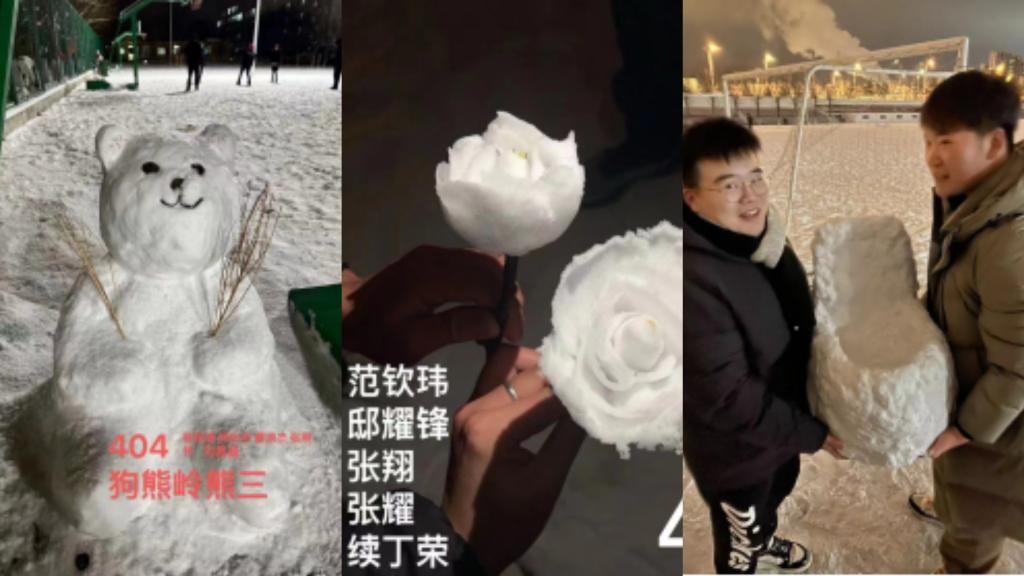 活动中,同学们充分发挥想象力和创造力,同寝室配合默契,利用手边的工具,堆出一个个造型迥异的雪人。