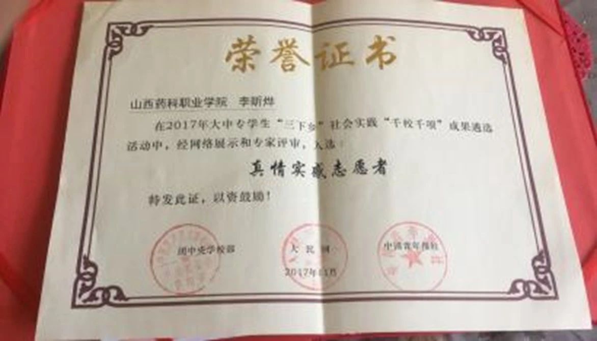 志愿者李昕烨同学获得团中央颁发的“真情实感志愿者”荣誉。