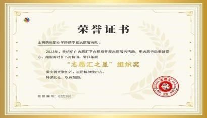 “百舸争流,点赞志愿”活动中,我院药学系志愿服务队荣获“志愿汇之星”组织奖;