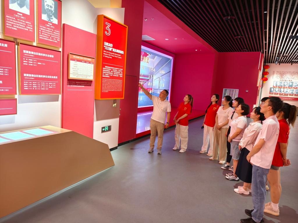 实践队首先来到参观了桐峪·1941博物馆。博物馆以展示红色文化为基调,主要由中国民主制度博物馆、中国钱币博物馆红色金融教育馆、互动体验区三部分组成。跟随着老师们的步伐,队员们仔细聆听着每一个历史细节,了解了中国民主制度的探索历程,以及红色货币的演变历程,思政部主任任俊峰为学生讲述了中国共产党“三三制”民主政权的发展历程。一件件珍贵的文物无不述说着当年的党史故事,让队员们对英雄先烈的英勇无畏和无私奉献精神有了更深刻的认识。