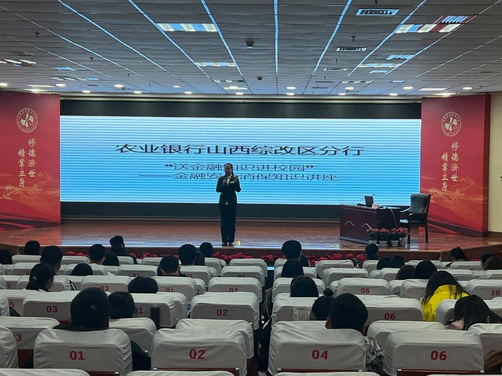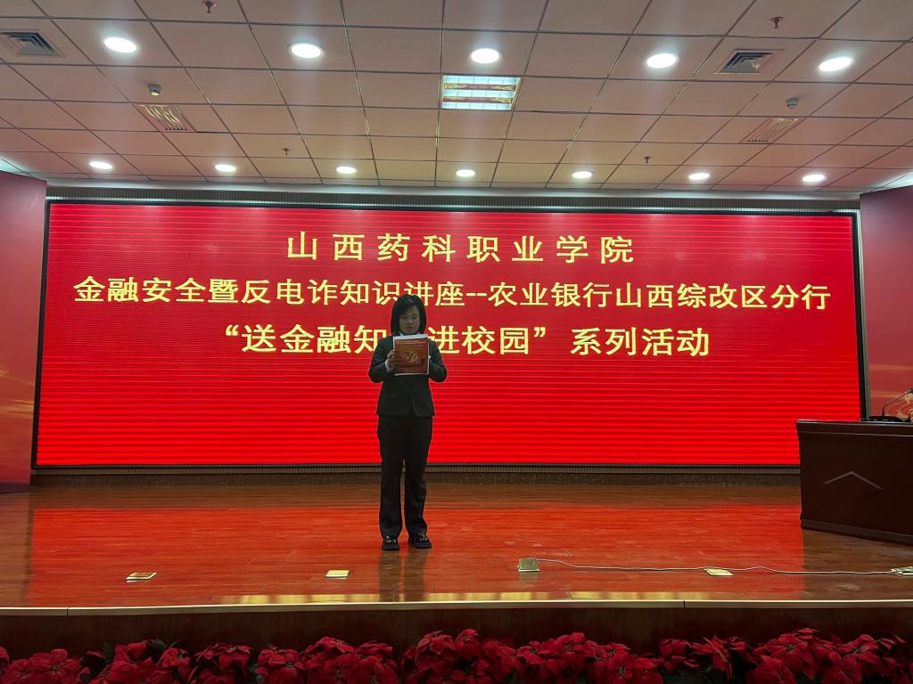 近日,学院特邀农行山西迎宾支行行长邢红丽、农行山西综改区分行零售金融部消保专员王璐以及太原市小店区黄陵派出所副所长李静来我院,为我院学生作“金融安全暨反电诈知识”主题讲座,各班学生代表参加讲座。