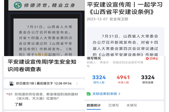 活动主要对今年审议通过的《山西省平安建设条例》及《山西省学校学生人身伤害事故预防与处理办法》进行了宣传和学习,同时组织3000余名学生进行了安全知识问卷调查,对学院200余名保洁、餐饮服务人员进行了安全培训,联系消防救援站入校开展消防演练等活动。活动的开展,进一步增强了师生员工的安全意识,切实筑牢校园安全防线,为创建平安校园提质增效。