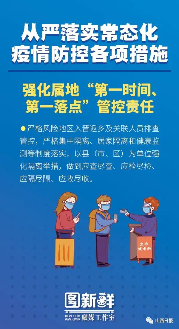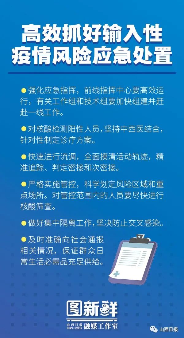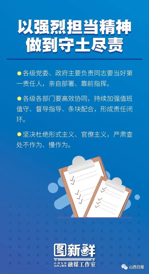 他强调,要深入学习贯彻习近平总书记考察调研山西重要指示精神,认真落实党中央及省委关于疫情防控的部署要求,坚持“外防输入、内防反弹”总策略和“动态清零”总方针,抓紧抓实抓细疫情应急处置和常态化疫情防控各项措施,以果断有力行动迅速扑灭疫情燃点,巩固来之不易的疫情防控成果。
