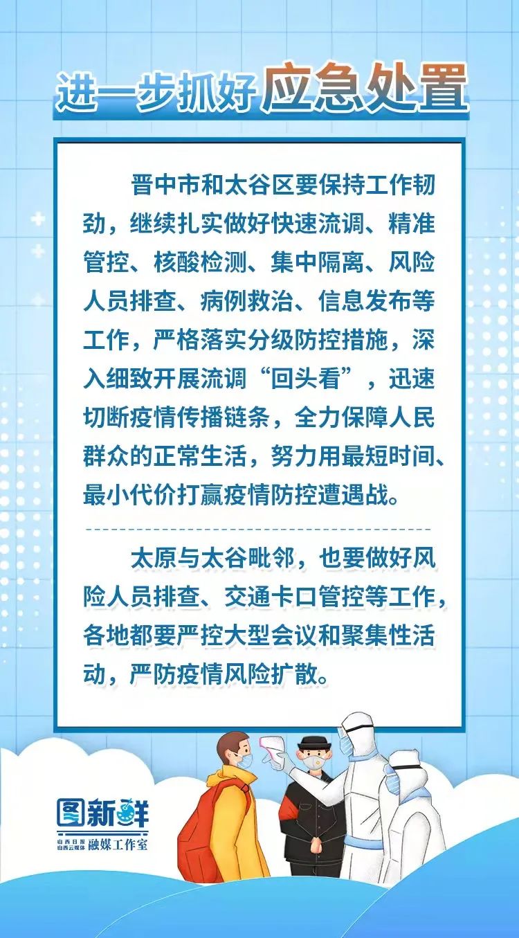 他强调,要深入学习贯彻习近平总书记考察调研山西重要指示精神,认真落实党中央及省委关于疫情防控的部署要求,坚持“外防输入、内防反弹”总策略和“动态清零”总方针,高效抓好晋中太谷输入性疫情风险应急处置,进一步强化常态化精准防控,确保全省疫情防控形势持续稳定向好。