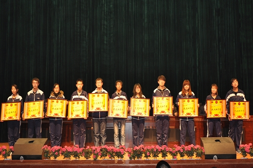 会上,张震云同志宣读了《关于公布2011~2012学年第二学期优秀学生奖学金获得者名单的通知》和2012年国家奖学金获奖学生名单;尹士优同志宣读了《关于表彰2011~2012学年“三好学生、优秀学生干部、先进班集体、优秀辅导员(班主任)”的决定》和2011年度省级先进班集体、个人名单。与会领导为获奖的13个先进集体和优秀个人代表颁发了奖牌和荣誉证书。