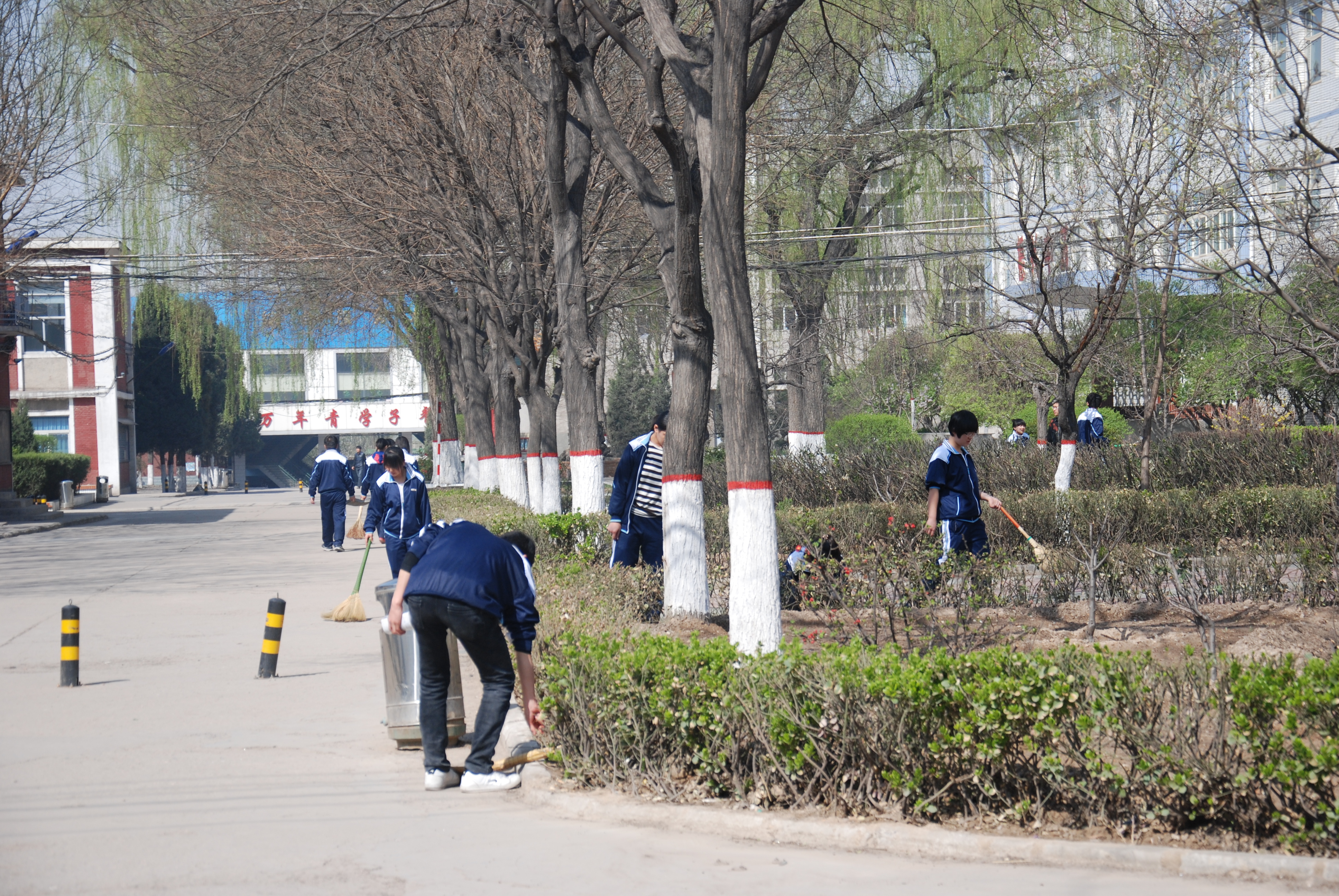 青年学生在老师的带领下,对校园内的教学楼后、公寓楼前等卫生死角进行清扫,对树上、绿篱中、公共区域的塑料袋、饮料瓶等白色垃圾进行了清理。