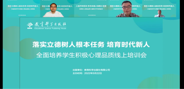 2022年5月22日,心理健康教研室全体专兼职教师参加由教育科学出版社有限公司举办的《落实立德树人根本任务 培育时代新人——全面培养学生积极心理品质线上研讨会》。