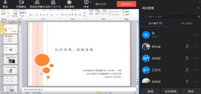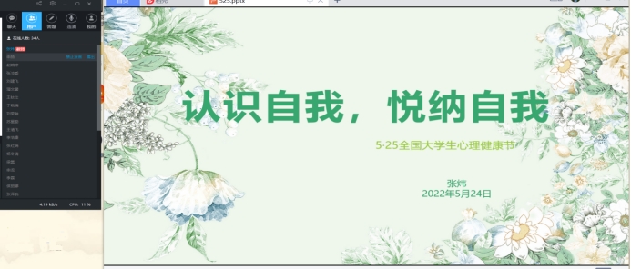 5月24日,学生工作部心理健康教育中心老师为学生开展题为《小得盈满既是圆满——认识自我,悦纳自我》心理健康教育主题云讲座,讲座以5月21日小满节气的含义引入,指出人生如同小满,可能不够完美,也可能遇到挫折,重要的是认识自己,悦纳自己;然后围绕大学生如何培养健全的自我意识与同学们进行了分享。讲座受到同学们的欢迎。