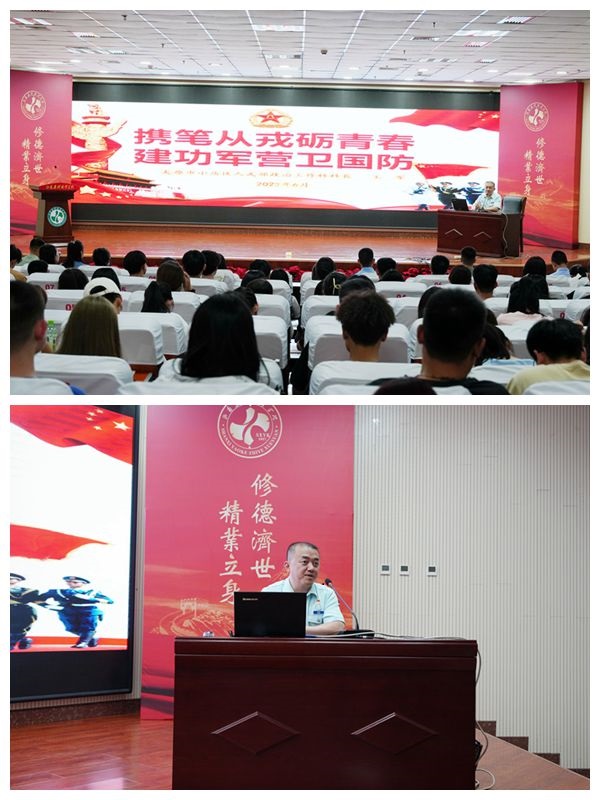 宣讲团成员、优秀退伍军人代表程堃、李少杰、郭少飞三名同志作了宣讲报告,他们结合自身经历与师生们分享了他们的军旅生活、奋斗历程和成长经验。王军科长以“征兵宣传进校园 携笔从戎砺青春”为题,从征兵流程、经济补助、优惠政策、个人成长等多方面进行了深入解读,并详细介绍了入伍与复学、学历提升、就业与公务员招考、部队培养等方面的优惠政策。