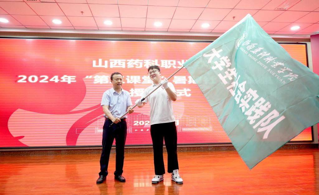 院党委书记王旭宣布2024年第三课堂暑期社会实践活动启动,并为实践团队代表授旗。王旭希望同学们在即将开展的暑期社会实践活动中锤炼意志、开阔眼界、提高本领,在服务社会中实现自身价值,以自身的成长成就构筑起学院实践育人工作成效,上好社会实践这一行走的“大思政课”。