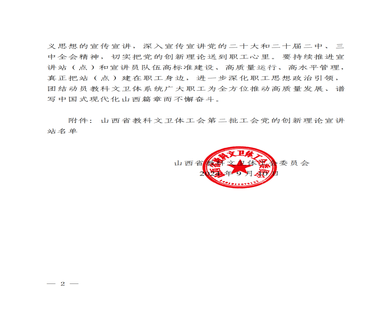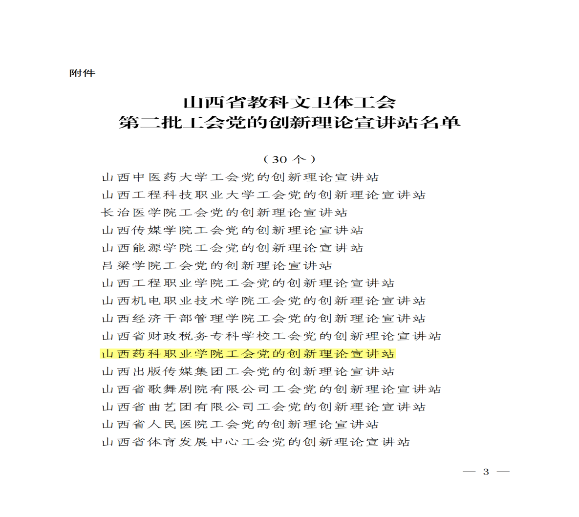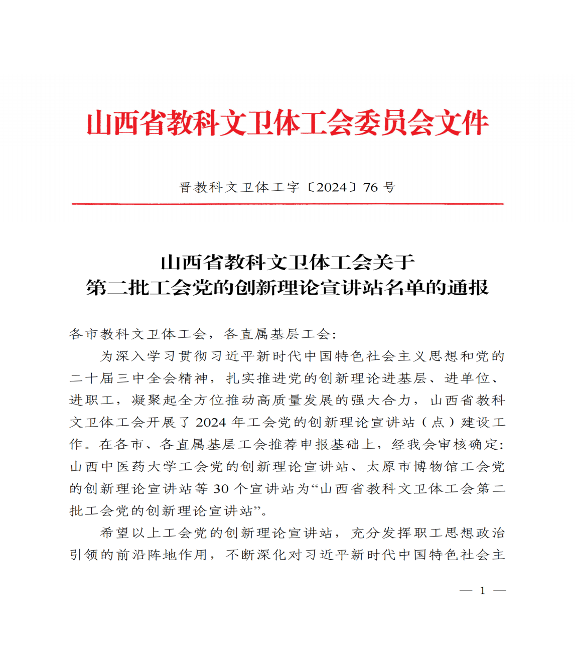 近日,山西省教科文卫体工会公布了关于第二批工会党的创新理论宣讲站名单的通报,山西药科职业学院党的创新理论宣讲站被命名为山西省教科文卫体工会第二批工会党的创新理论宣讲站。