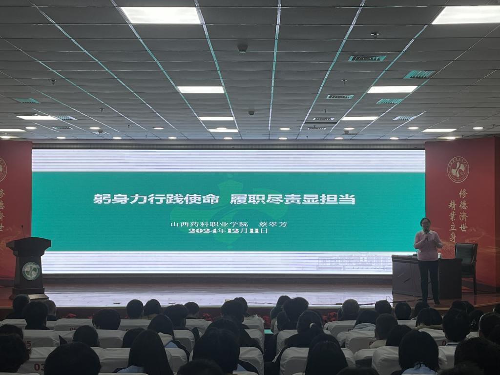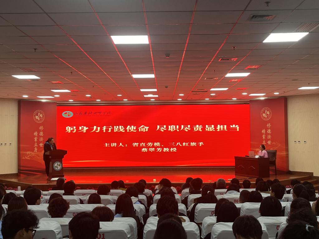 活动在学院综合报告厅举行。邀请山西省委联系的高级专家、省直劳模、三八红旗手、山西省“双师型”教学名师、山西省模范教师、“三晋英才”拔尖骨干人才蔡翠芳教授做题为《躬身力行践使命 履职尽责显担当》的专题讲座,向教职工与学生讲述了中国中国首位诺贝尔医学奖获得者、药学家屠呦呦与青蒿素的故事。40多年来,她全身心投入严重危害人类健康的世界性流行疾病疟疾的防治研究,默默耕耘、无私奉献,为人类健康事业作出了巨大贡献。蔡教授讲到,屠呦呦身上所体现了爱岗敬业、争创一流、艰苦奋斗、勇于创新、淡泊名利、甘于奉献的劳模精神,是社会主义核心价值观的生动体现,也是我们宝贵的精神财富和强大的精神力量。蔡翠芳教授“现身说法”,她与师生们分享自己多年来的工作经历、感悟和心得,指出工匠精神不仅是她前进的动力,也给予了她足够的底气,为她在事业上继续深耕细作、弘扬和传承中医药文化提供了强大动力。