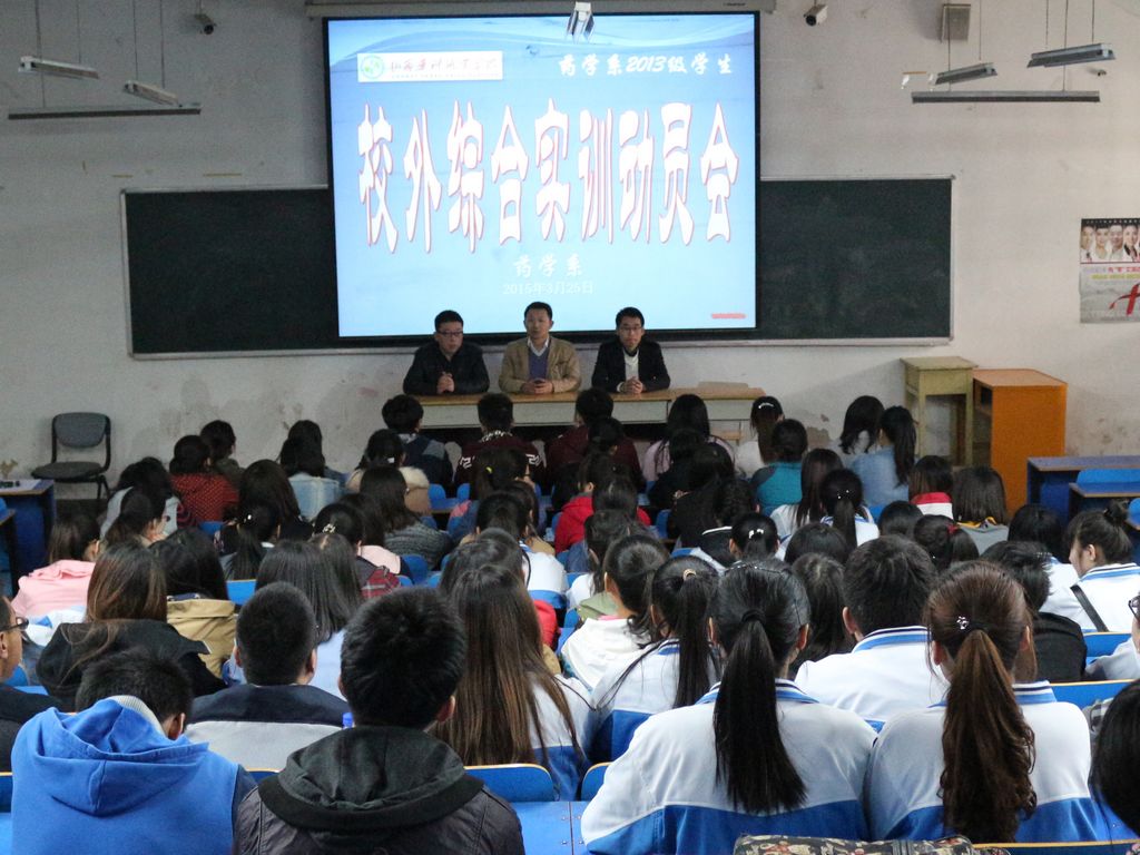 3月25日下午,药学系在一层一阶举行了2013级药检专业学生校外综合实训动员会。药学系党总支副书记韩晋平、药学系副主任王明军、辅导员李晨光出席了会议。会议由王明军主持,药检专业全体学生参加了动员大会。