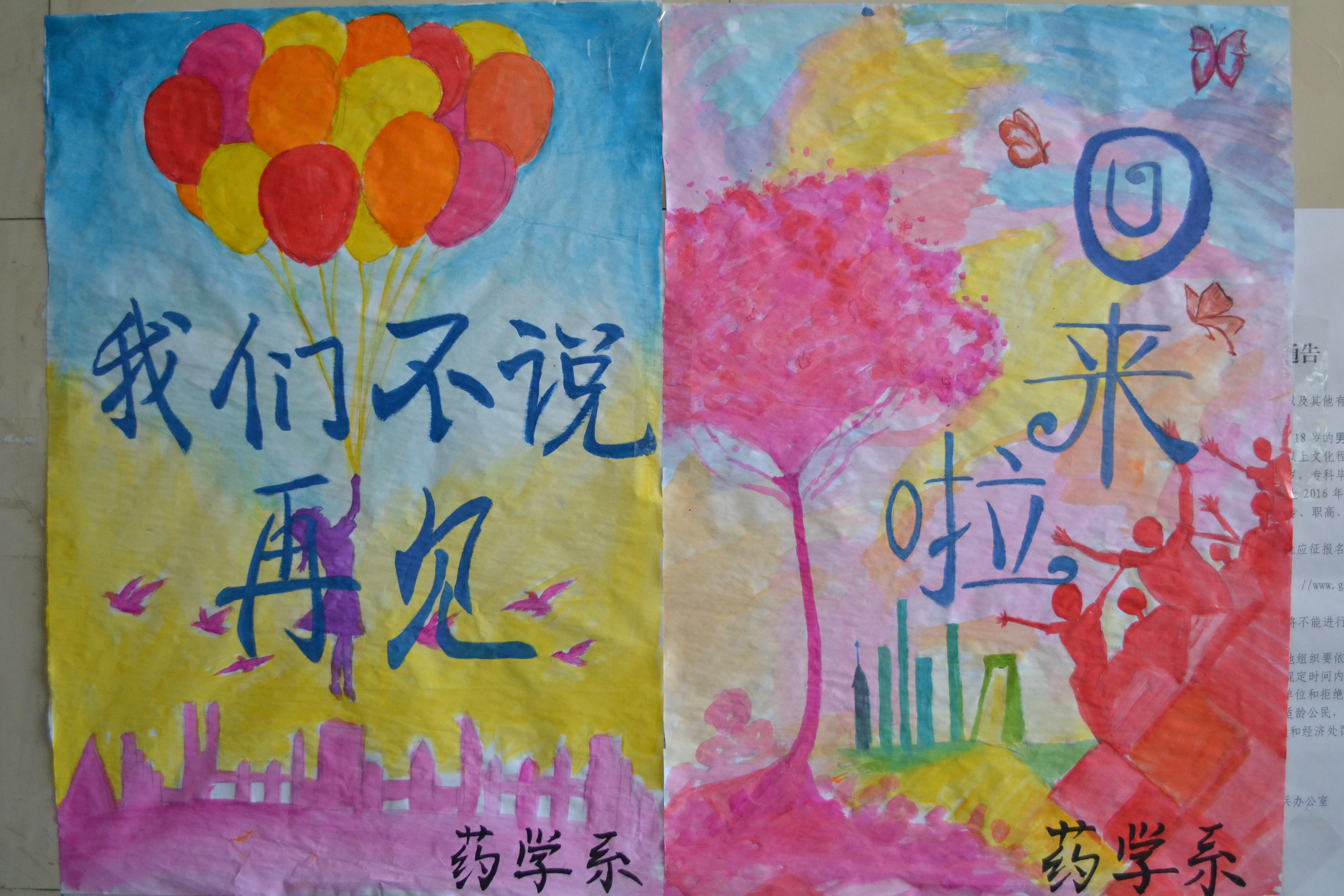 为营造毕业生文明、和谐的离校氛围。6月15日,药学系在东教学楼大厅张贴了“回来啦”“我们不说再见”等海报标语,欢迎毕业生返校,同时告知毕业生返校需要准备的相关资料与办理离校手续流程。