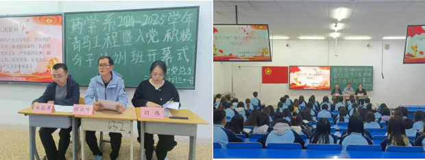 为进一步推动党的二十大,二十届三中全会精神入脑入心,10月31日,药学系在东教学楼一层一阶教室举办了“2024—2025学年'青马工程'暨入党积极分子培训班开班仪式”,党总支副书记程俊峰、专职组织员闫伟出席,110名入党积极分子、全体团学骨干参会。分团委书记白汇军主持此次开班仪式。